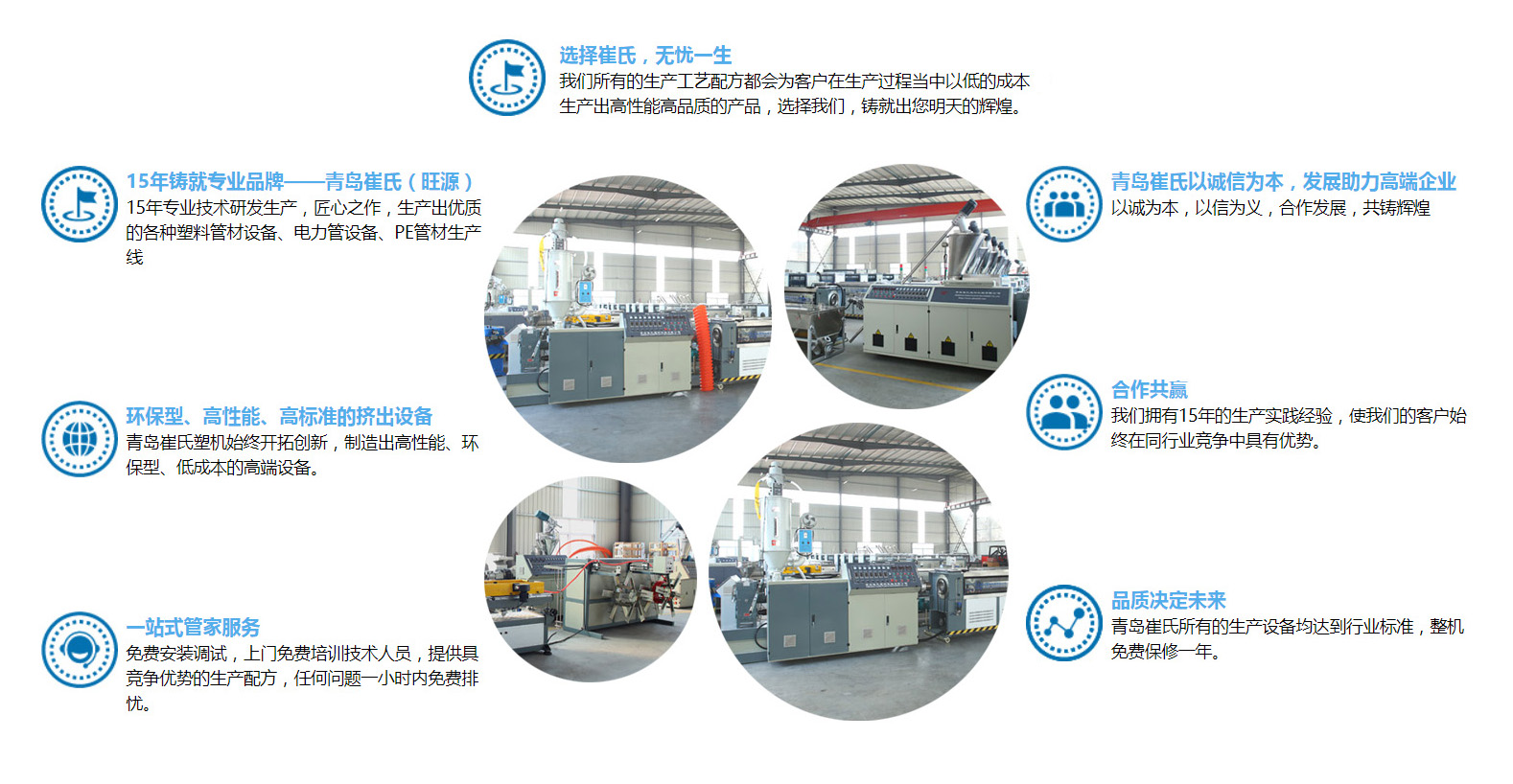 青島崔氏塑料機(jī)械有限公司始終以開(kāi)拓創(chuàng)新的精神,緊跟世界塑機(jī)行業(yè)的發(fā)展趨勢(shì),專注研發(fā)與生產(chǎn)預(yù)應(yīng)力波紋管全線設(shè)備,公司已有20多年的生產(chǎn)與實(shí)踐經(jīng)驗(yàn),在市場(chǎng)大環(huán)境下,緊跟國(guó)家發(fā)展趨勢(shì),使我們的客戶在市場(chǎng)競(jìng)爭(zhēng)中有一席之地,人生就是不斷決定的過(guò)程、決定沒(méi)有對(duì)與錯(cuò),只有得與失!選擇崔氏我們定不負(fù)卿。